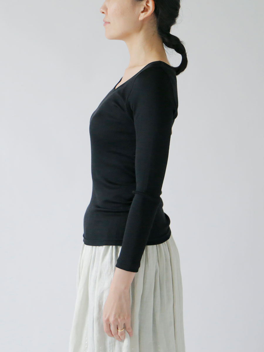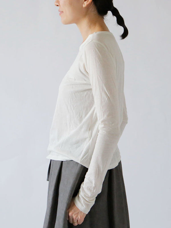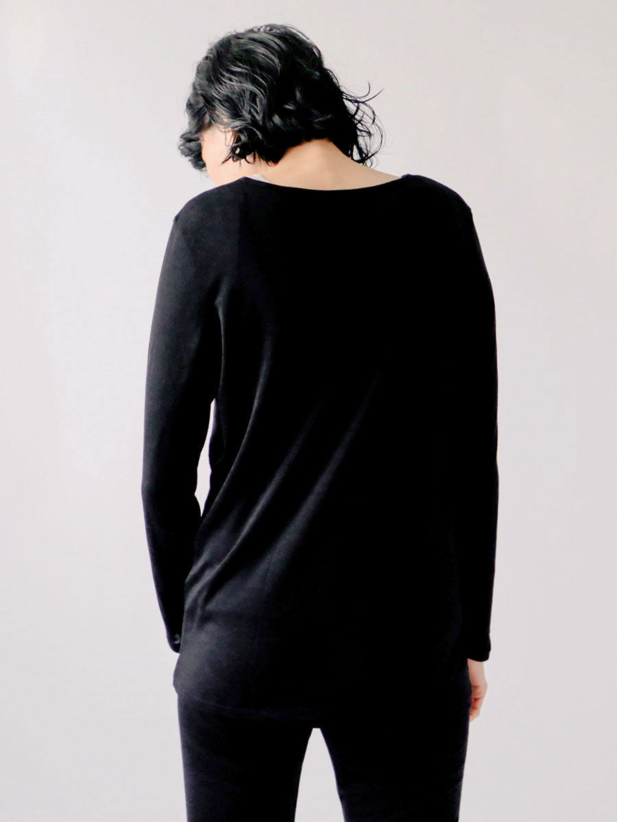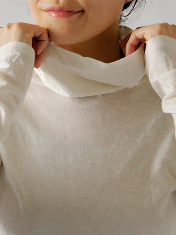 カシミヤが10%入っているだけでほんのりあたたか。なめらかな肌触りが気持ちいい。うすい繊細な生地なので冬の下着代わりに。身幅はゆったりと、袖巾は細めの絶妙なシルエット。一枚ではもちろん、セーターやワンピースの重ね着にもおすすめです。