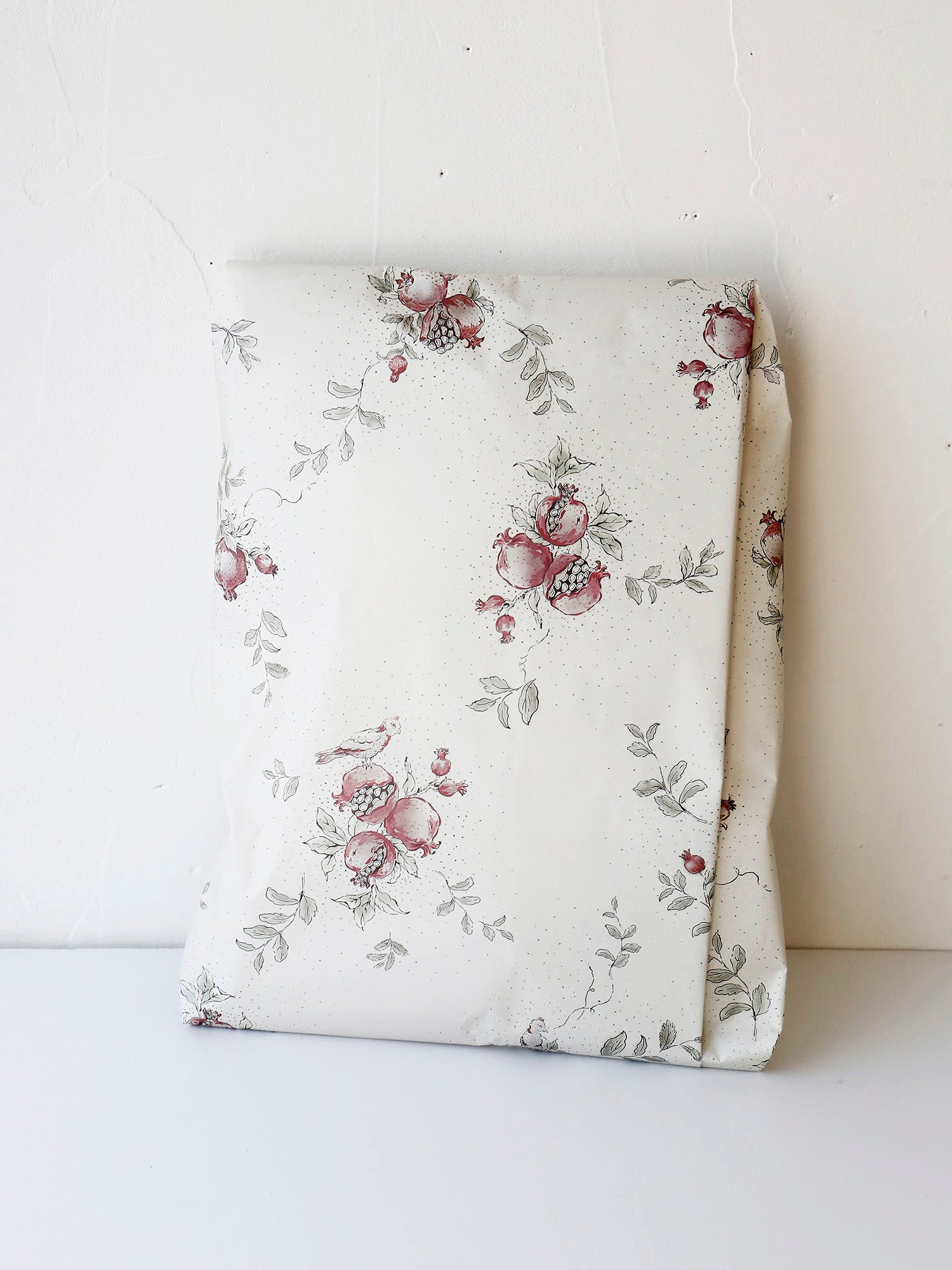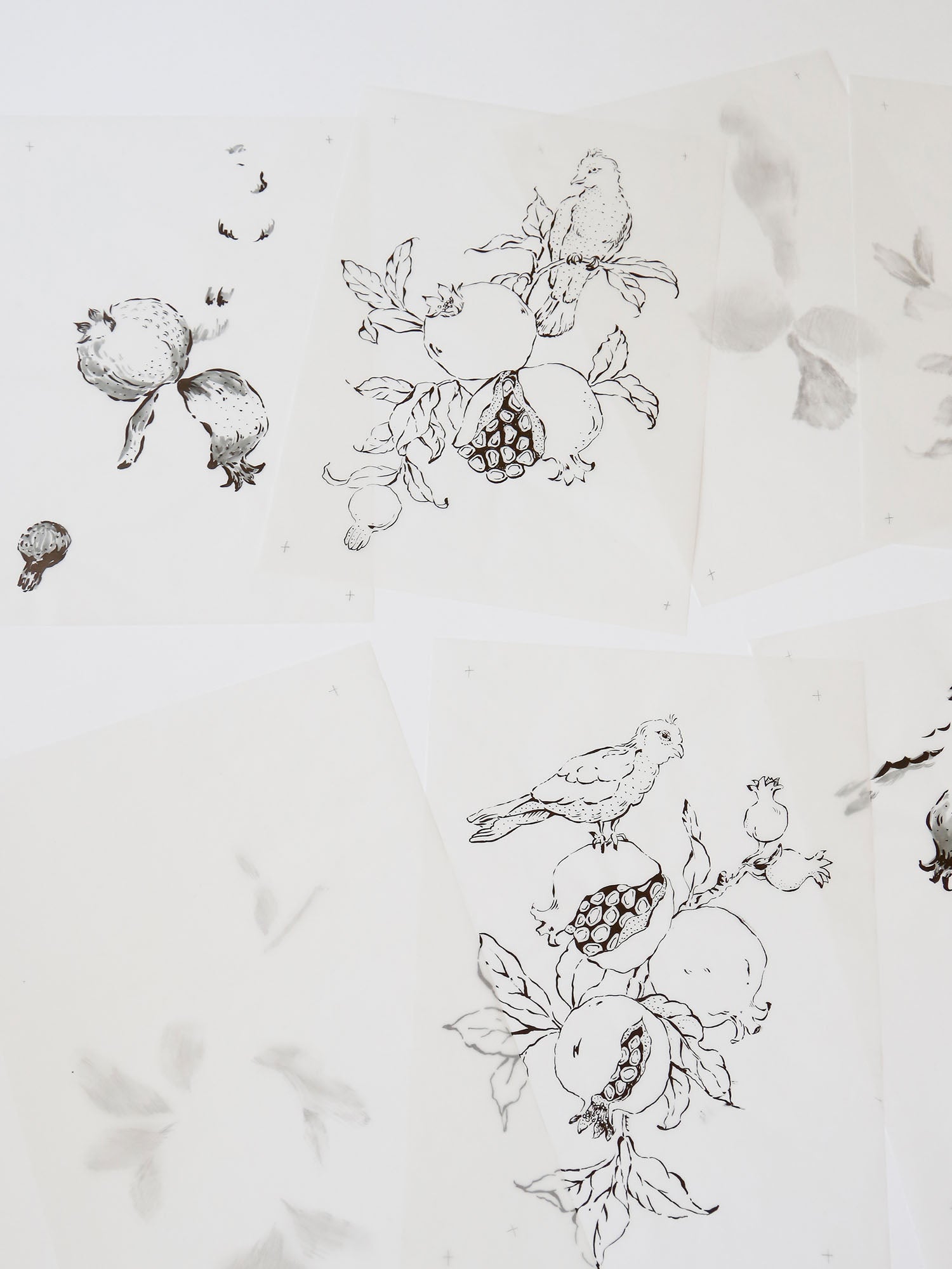《柘榴》は、色ごとに原画を分け、一枚ずつ筆で手描きしたものを重ね合せて描いています。手描きならではの風合いや揺らぎを大切にしながら、水彩のようなやわらかな色使いで仕上げました。
