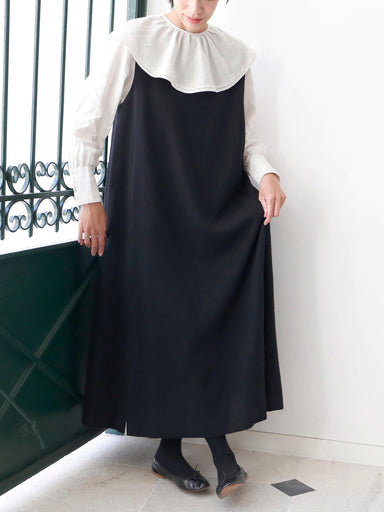 ふっくらとした、やわらかな質感が秋冬ムードを高めてくれるウールリネンのジャンパースカート《ブリッタ》。シルエットはゆるやかに広がるAライン。両裾にはスリットを入れて、さりげないアクセントにしました。