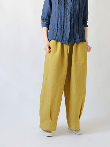 メンズライクなウールギャバのペグトップパンツ。 前後にセンタープレスを入れ、すらりとした印象をつくる縦のライン。ゆったりとした腰まわりから、裾にかけてすっきりと細くなるシルエットは、リラックス感の中にも凛とした印象を与えます。穿くだけで、自然に立体感のあるラインが生まれる一本です。 両脇にはス...