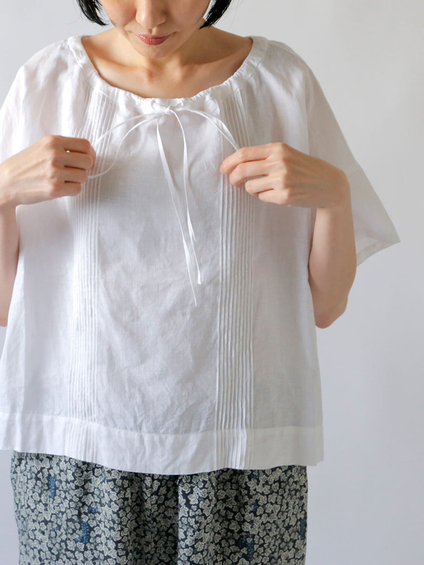 コットンポプリンのノーカラーヨークワンピース。袖つけに切り替えのないキモノスリーブ。余計な装飾のないシンプルなデザインです。