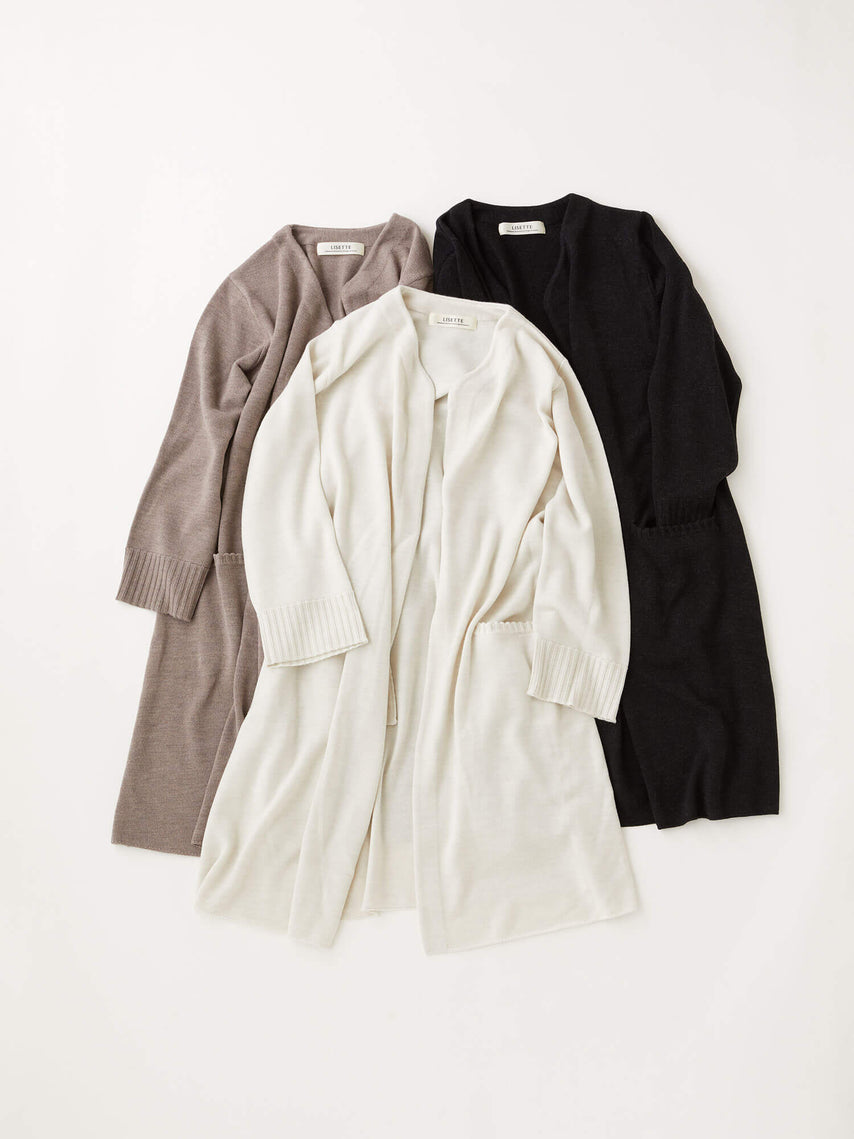 イタリアの梳毛糸を使用したハイゲージのロングカーディガン。