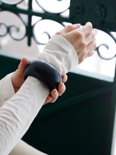 【リゼッタオンラインブティック・リゼッタ日本橋店限定商品】 “Black cuff” 墨染めのブレスレット 木の質感を生かしたマットブラックのウッドブレスレット。複雑な墨色と自然の木肌色が重なることで生まれる、奥行きのある色合いです。 染料には、赤松を焚いて採取した煤から得られる「松煙(しょう...