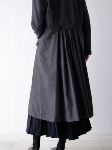 イタリア製の梳毛ウールで仕立てたロングコート。 裾に向かって自然に流れるソフトプリーツが、立ち姿に美しいラインを生み出します。 毛羽立ちのない、さらりとした手ざわり。ウールとは思えないほどのなめらかさが魅力です。 ややトップのチャコールグレーの色合いが落ち着いたトーンで、どんな装いにも自然に馴...