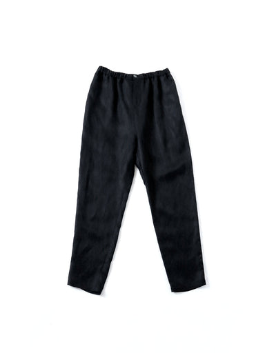 長繊維のリネンとレーヨンを撚り合わせた糸で織り上げた生地は、リネンの自然な光沢感とレーヨンが出すドレープ。ほどよいストレッチの効いた着心地の良さが魅力です。膝も曲げやすい。ラフな着心地ながら、きれいめに履きこなせるのは上質な生地が成せる業。