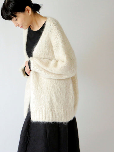 アンゴラ山羊から取れるモヘヤを贅沢に使用した光沢感のある糸はほわほわふんわり、素肌にも気持ちの良いとびきり上質な素材です。そんなイタリア製の甘く撚った太番手のロービング糸を、ざっくりと棒針で手編みした《ナネット》。 ボタンやフックは無く、さっと羽織れる自由度の高いカーディガン。寒い季節ならではの華やかな装いをお楽しみください。