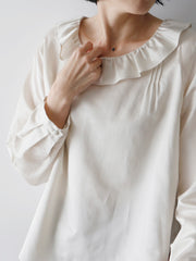 きれいめなブラウスで品よく。ニットを重ねても端正さを残しつつ、リラックスした装いにまとまります。