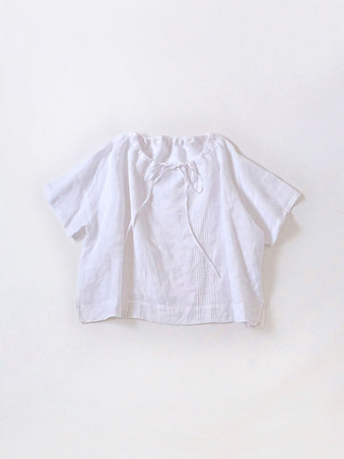 爽やかな真っ白いリネン生地に、細かなピンタックが施されたブラウス《ペラジー》。襟ぐりに通ったリボンがかわいらしい印象です。