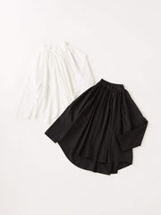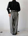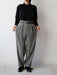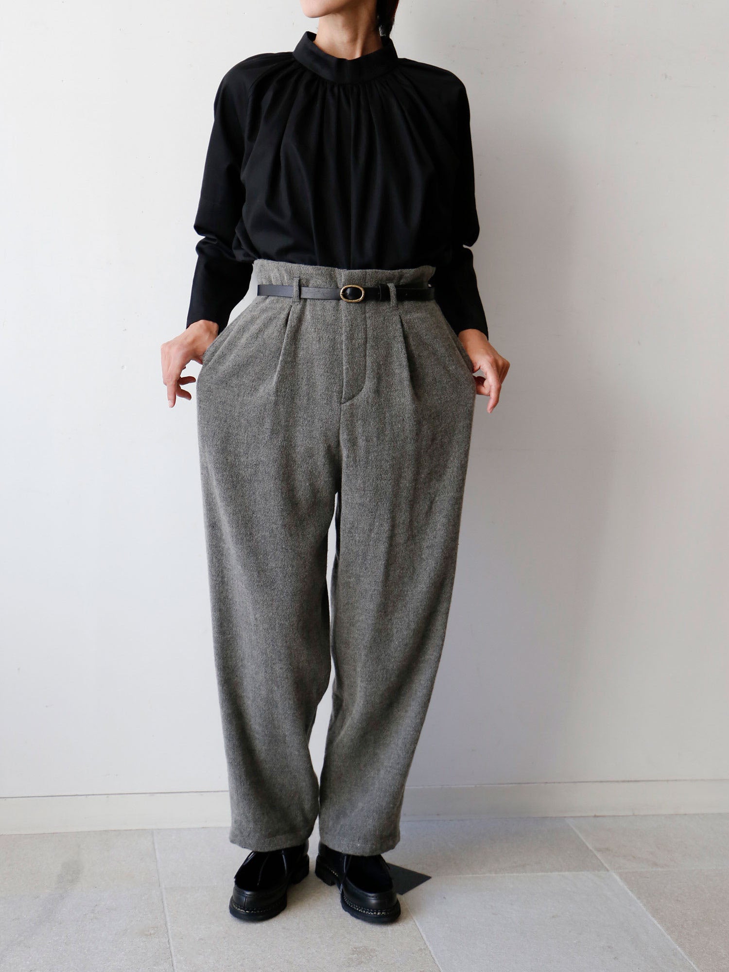 裾に向かってゆるやかにすぼまったシルエット。フロントにボックスタック、バックウエストにはゴムとギャザーを入れ、マニッシュな中にも女性らしさを感じるかたちです。