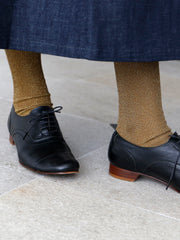 深みのあるシャンブレーリネンのスカートと合わせれば、秋らしいシックなスタイルに。ラメ入りソックスで、さりげないアクセントをプラスしても。